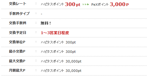 ハピタス自体が換算率が良いポイントサイトなので、ポイント自体が貯めやすく、PeXへの交換手数料無料なのですが、月間最大交換ポイントに30,000ptという上限があります。