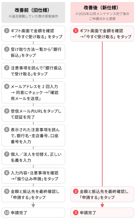 デジタルギフト経由での交換申請は前回の仕様よりもスムーズにになり、申請後から受け取りまでの操作ステップが簡略化され、対応手順が大幅に削減しています。