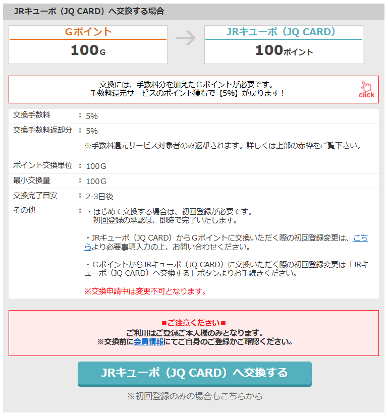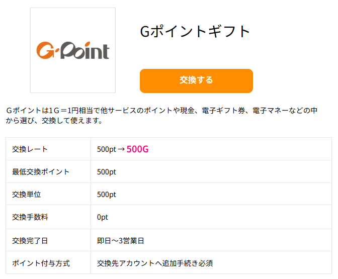 ・Gポイント経由:交換手数料 なし(通常は5%)