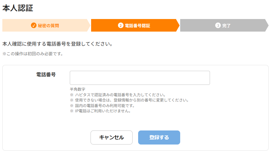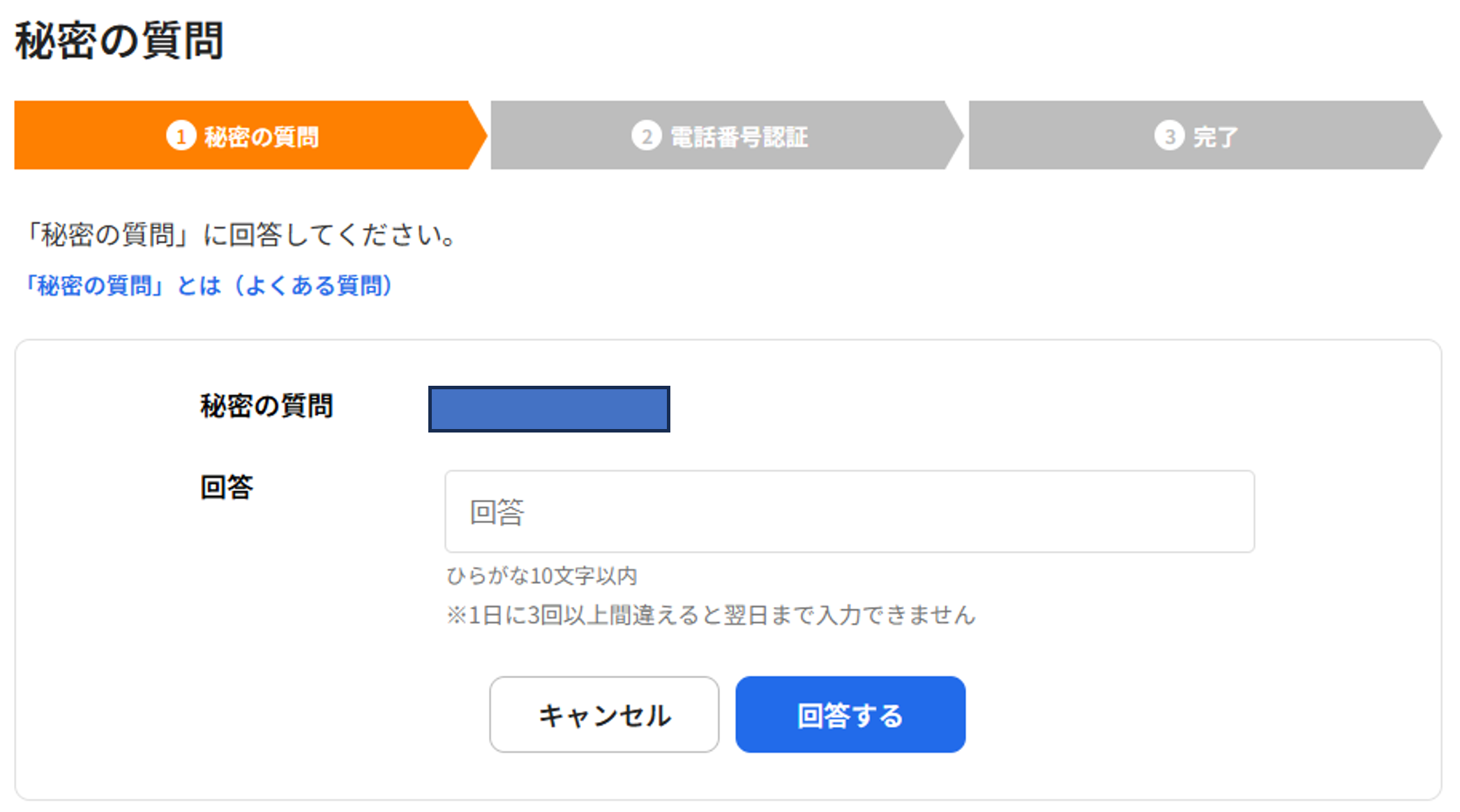 次に、ハピタス登録時に設定していた「秘密の質問」に回答して進めます。