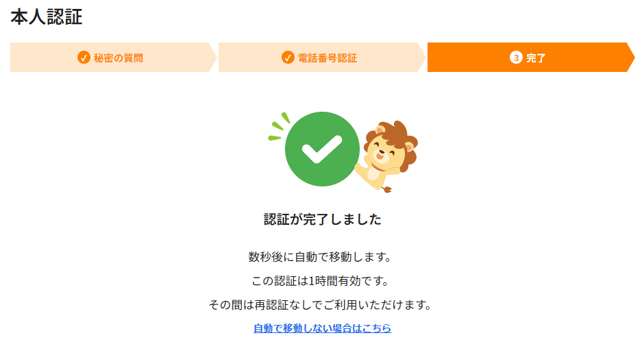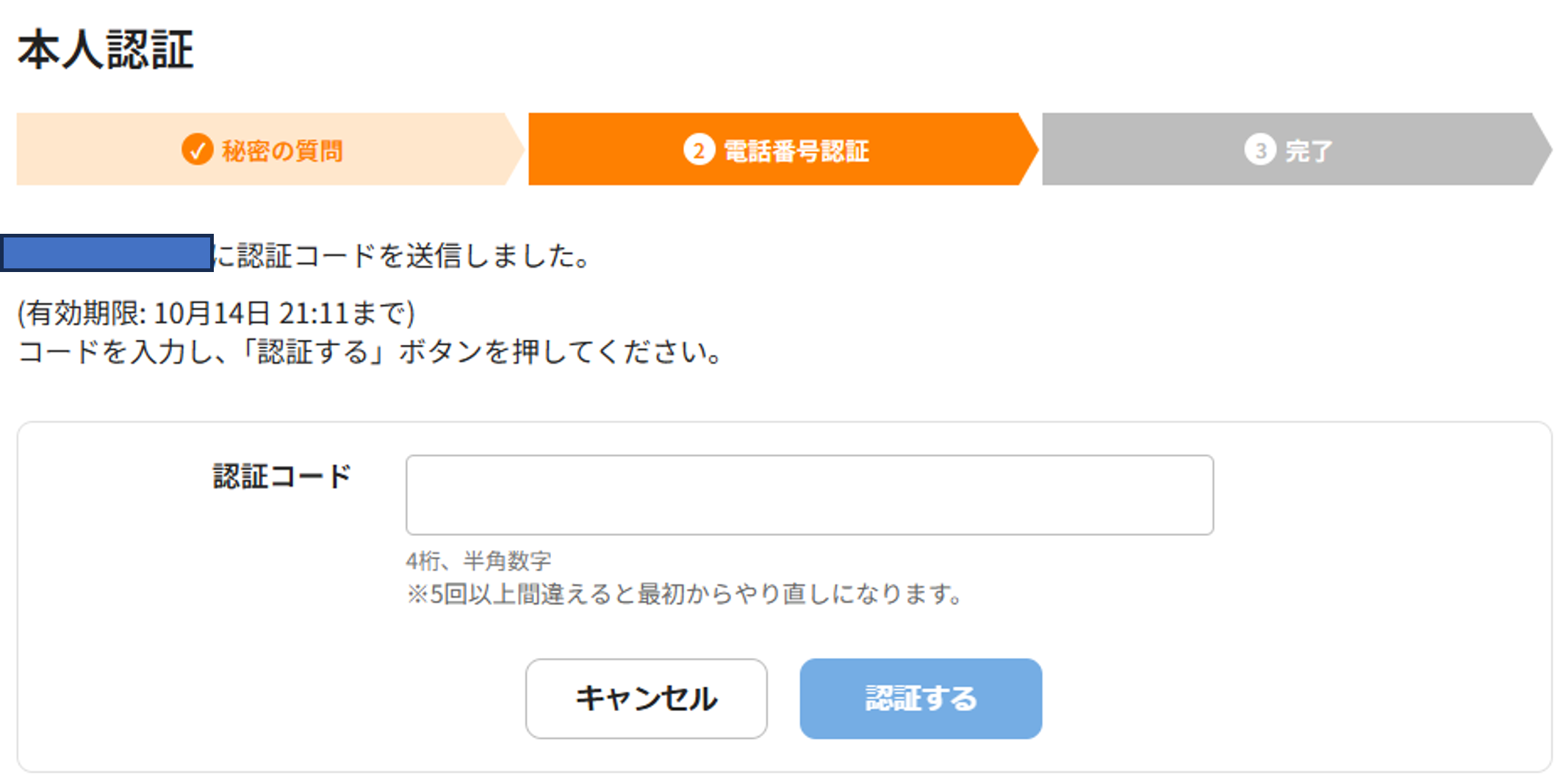 登録済みの「電話番号」を入力すると、下図の通り「認証コード」が携帯電話に届きますので、入力します。