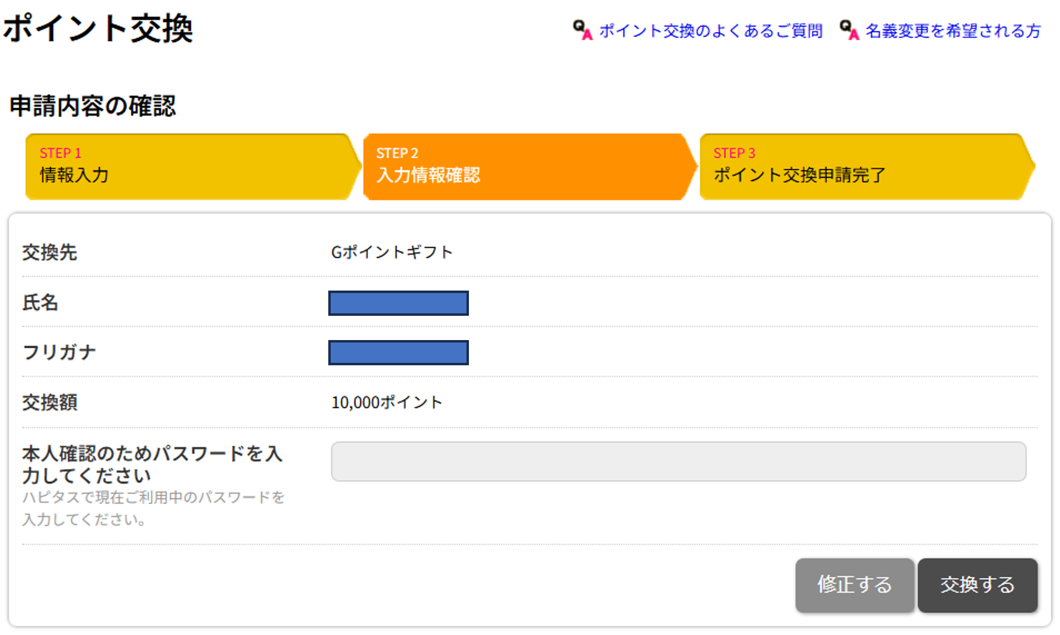 入力した交換額を確認し、ハピタスのサイトに入る際の「パスワード」を入力します。