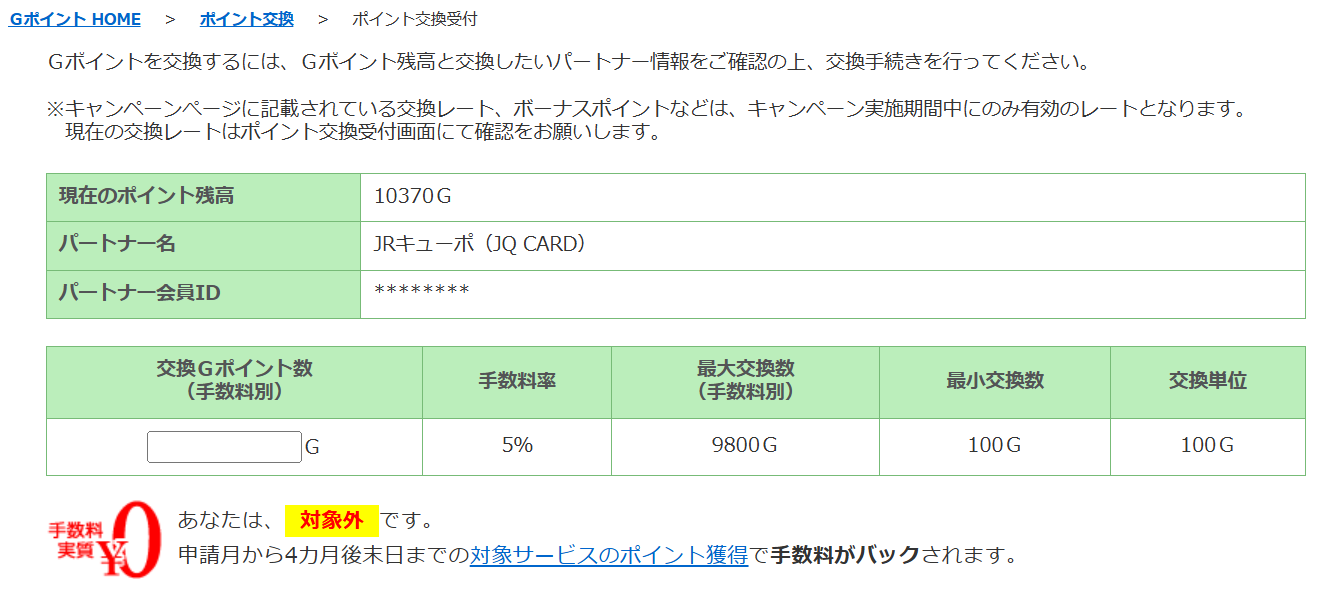この段階では手数料5%が必要となり、手数料実質ゼロ円の「対象外」となっていますが、この交換作業の後にGポイントを利用していますので、後日手数料5%分のGポイントが返却されます。