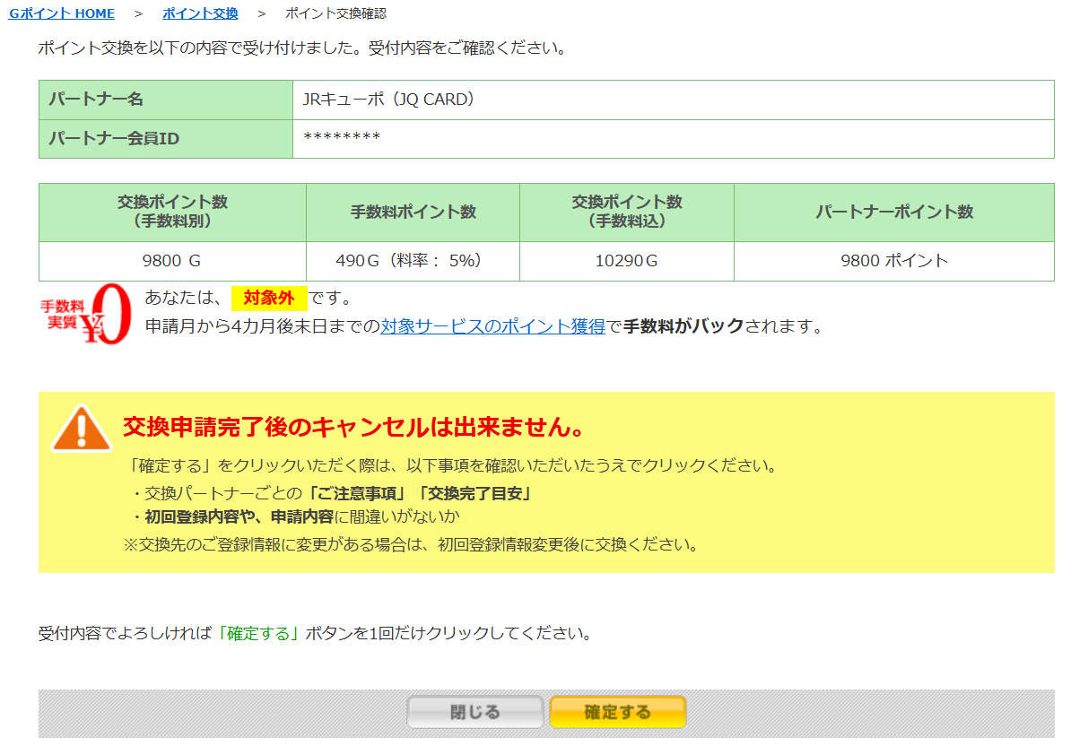 上図の通り、交換手数料5%分である490Gは後日Gポイントとして戻りますので、実質手数料なしで等価交換ということになります。