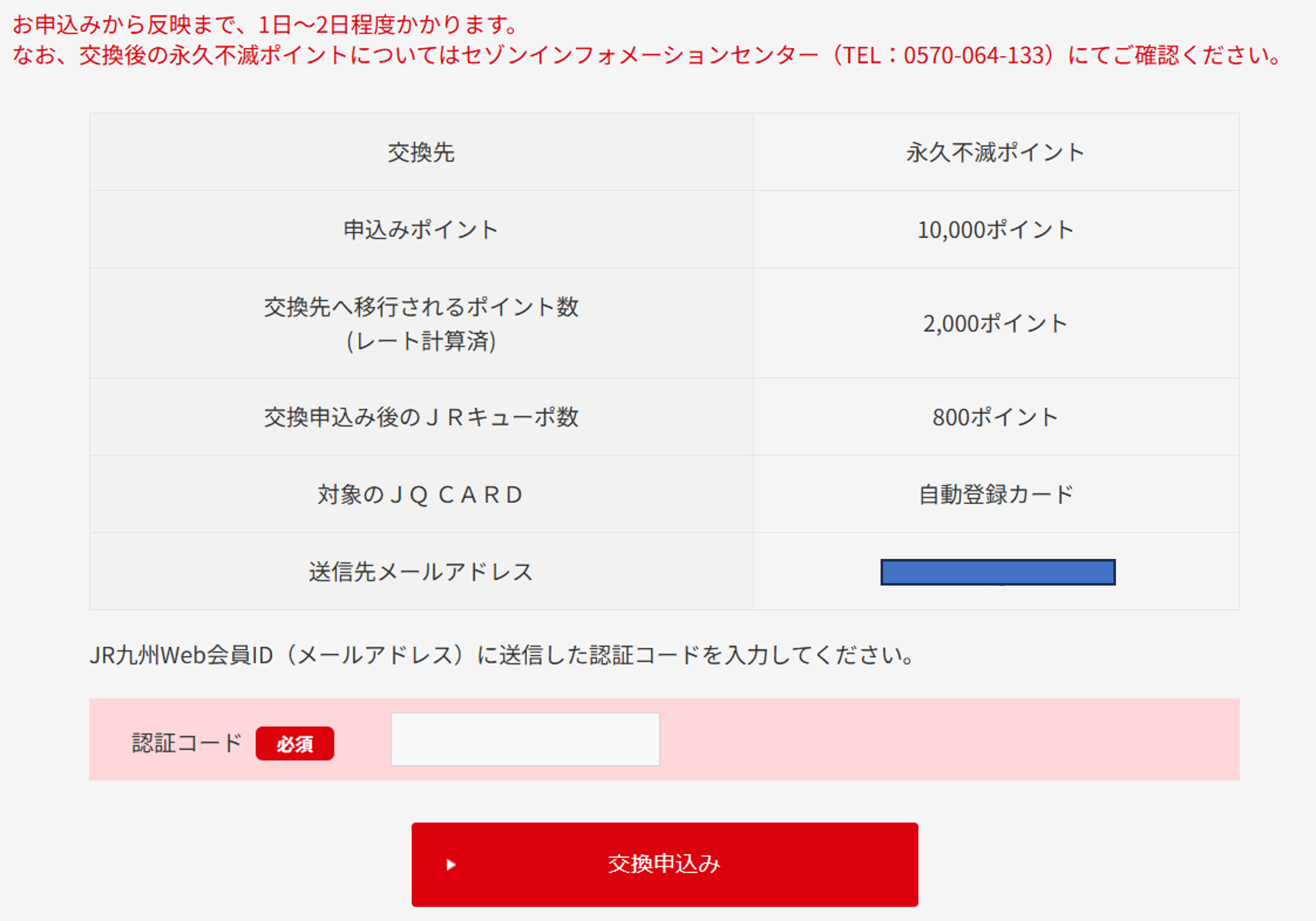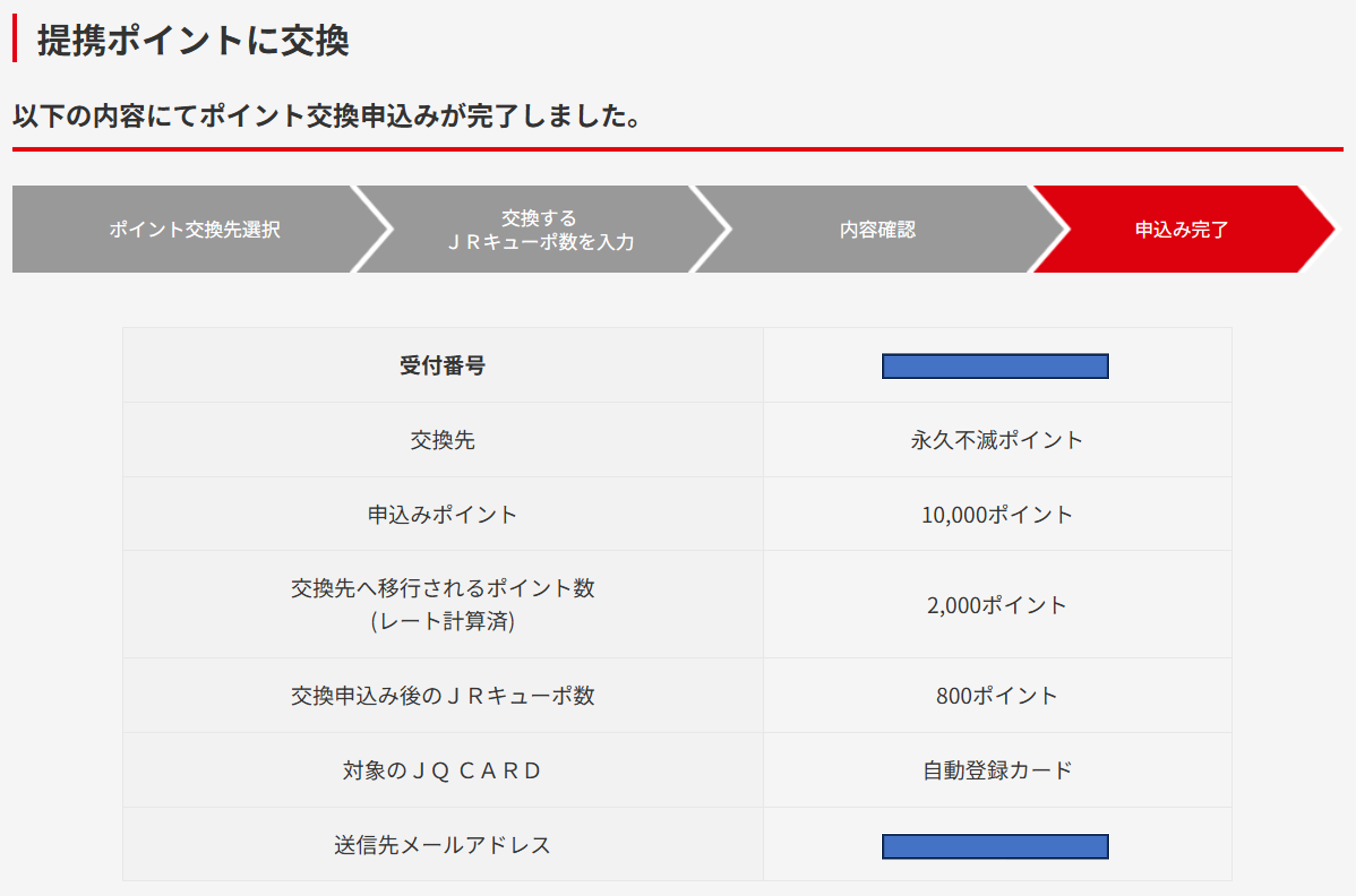 これでJRキューボから永久不滅ポイントへの交換は完了です!