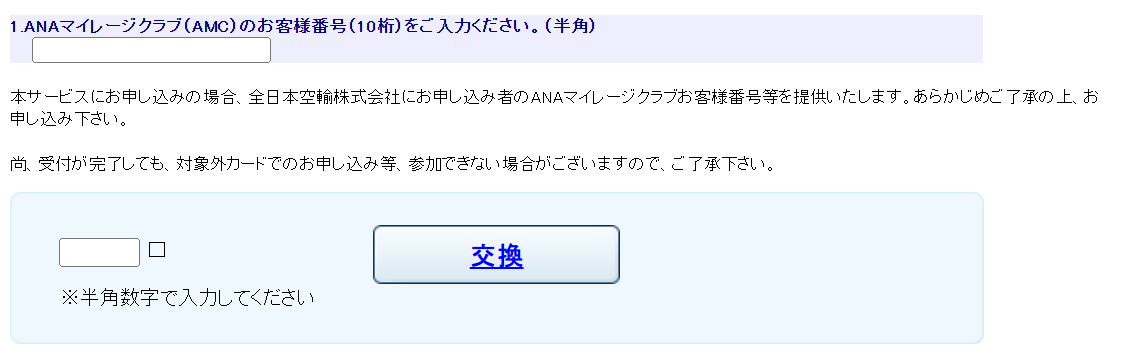下図の通り、「ANAマイレージクラブ(AMC)のお客様番号(10桁)」と申し込み「口数」を入力します。