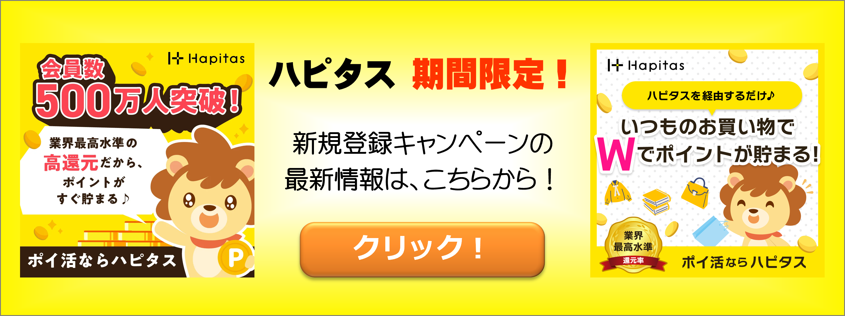 <広告>今ならこちらのバナー経由で新規登録すると大量のハピタスポイントが獲得できます!★ 新規登録キャンペーンの詳細はこちら ★